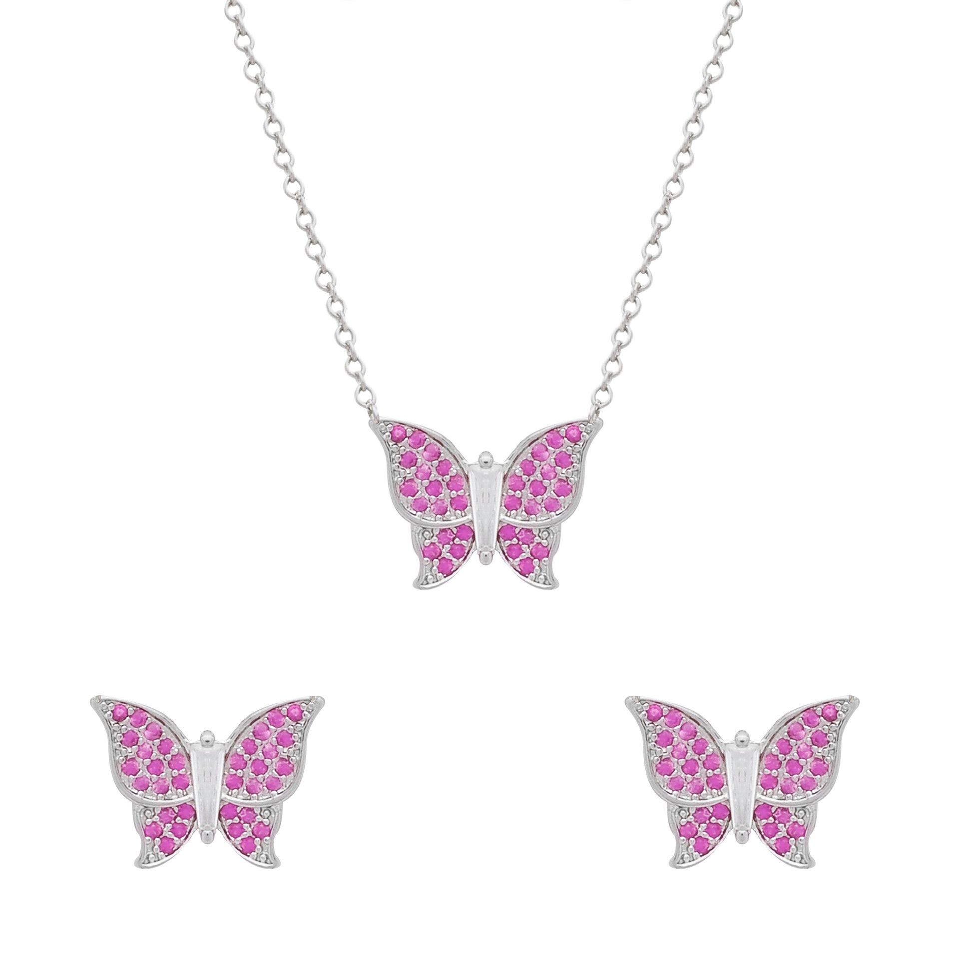 Conjunto Prateado de Borboletas Cravejado de Zircônia Rosa